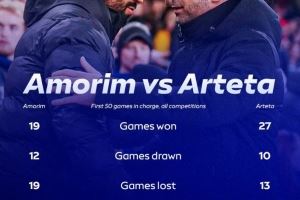 体育资讯10月11日讯 天空体育对比了阿莫林执教曼联前50场比赛,与阿尔特塔执教阿森纳的前50场战绩对比,具体如下(各项赛事):